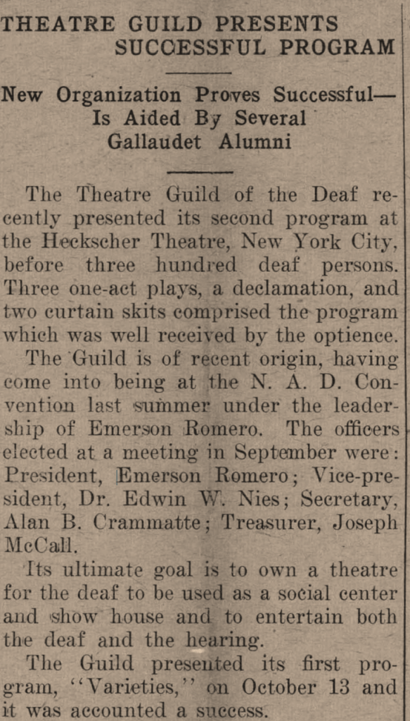 Along with Sam Block and John Funk, in 1934 Romero established the Theatre Guild of the Deaf. The goal of the Guild was “to own a theatre for the deaf to be used as a social center and show house and to entertain both the deaf and the hearing.” Romero directed 20+ deaf actors.
