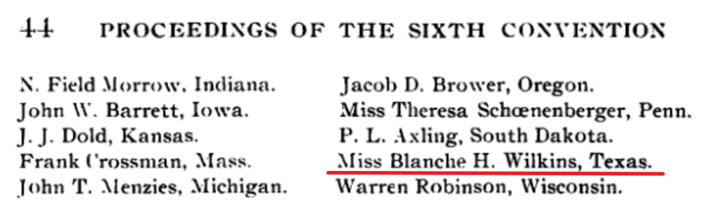 Wilkins briefly taught at the Texas School for Colored Deaf and Blind from 1898-9. She was the sole delegate from Texas who attended the 6th annual National Association for the Deaf conference, held in St. Paul, Minnesota in 1899.